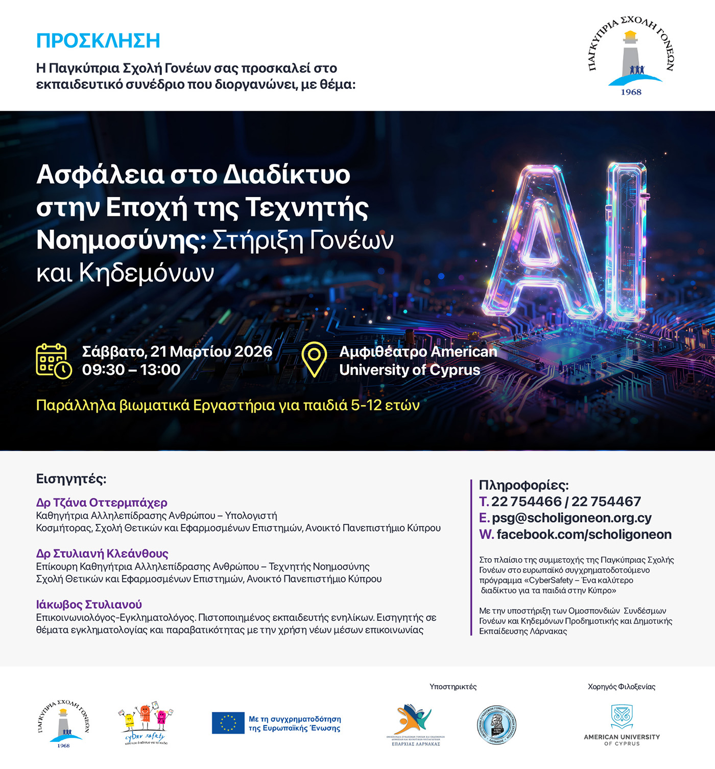 20/03/2026 ΑΣΦΑΛΕΙΑ ΣΤΟ ΔΙΑΔΙΚΤΥΟ ΣΤΗΝ ΕΠΟΧΗ ΤΗΣ ΤΕΧΝΗΤΗΣ ΝΟΗΜΟΣΥΝΗΣ: ΣΤΗΡΙΞΗ ΓΟΝΕΩΝ ΚΑΙ ΚΗΔΕΜΟΝΩΝ